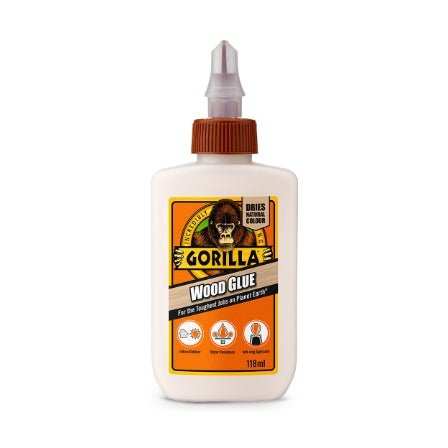 The hard-working, water resistant wood glue. For a strong, fast bond across a variety of wood surfaces, Gorilla Wood Glue is the hard-working, water resistant formula, perfect for indoor and outdoor use. Gorilla Wood Glue offers the benefits of an easy-to-use, water based PVA adhesive, with the holding power that Gorilla is known for. It dries a natural colour so you’re guaranteed a clean-looking bond line for your projects.