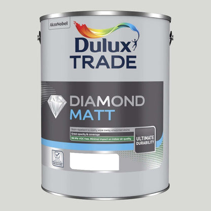 Dulux Trade Diamond Matt is a durable, easy-to-clean emulsion paint with a smooth, flat finish. Ideal for high-traffic areas, its Stain Repellent Technology helps prevent stains from penetrating the surface, making cleaning a breeze. Highly scrubbable, it meets the highest cleaning standards (Class 1 ISO 11998, Type C BS 7719). Tested to withstand up to 10,000 scrubs, this means your walls can handle daily wear and tear, keeping your space looking great for longer. Our formula is 99.9% VOC-free*, complying with BREEAM and LEED certifications. Based on in-can VOC content and measured according to ISO 11890-2:2013.* Independently tested for indoor emissions, including formaldehyde, TVOC, TSVOC, and Cat 1A & 1B carcinogens.
