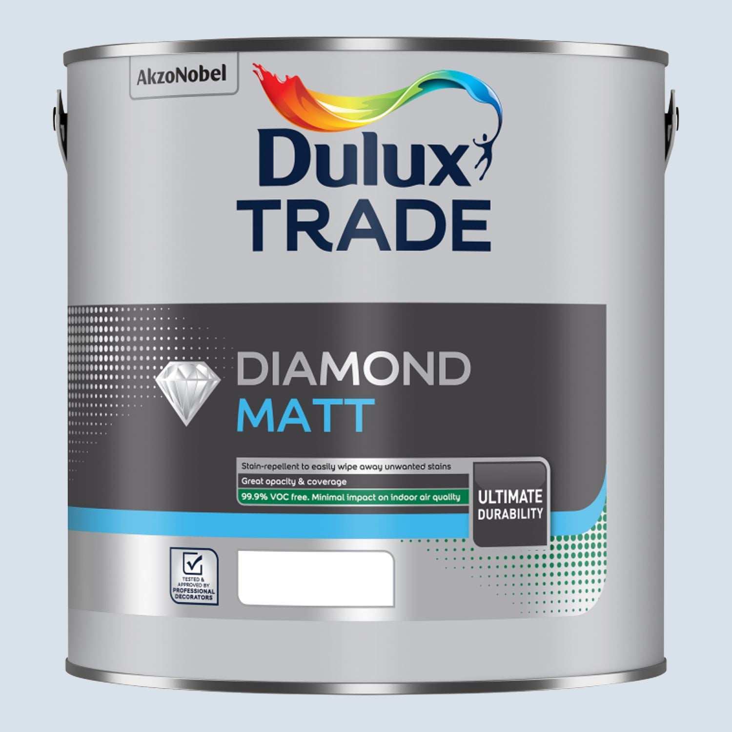 Dulux Trade Diamond Matt is a durable, easy-to-clean emulsion paint with a smooth, flat finish. Ideal for high-traffic areas, its Stain Repellent Technology helps prevent stains from penetrating the surface, making cleaning a breeze. Highly scrubbable, it meets the highest cleaning standards (Class 1 ISO 11998, Type C BS 7719). Tested to withstand up to 10,000 scrubs, this means your walls can handle daily wear and tear, keeping your space looking great for longer. Our formula is 99.9% VOC-free*, complying with BREEAM and LEED certifications. Based on in-can VOC content and measured according to ISO 11890-2:2013.* Independently tested for indoor emissions, including formaldehyde, TVOC, TSVOC, and Cat 1A & 1B carcinogens.