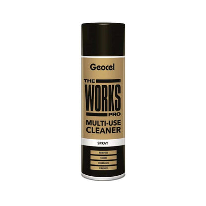 Geocel THE WORKS PRO Multi-use Cleaner is an all purpose spray which works in seconds. It removes uncured sealant, adhesive, grease, oil, tar and much more. Ideal for cleaning all surfaces before using the WORKS or painting. It can also be used for cleaning and degreasing surfaces and tools.