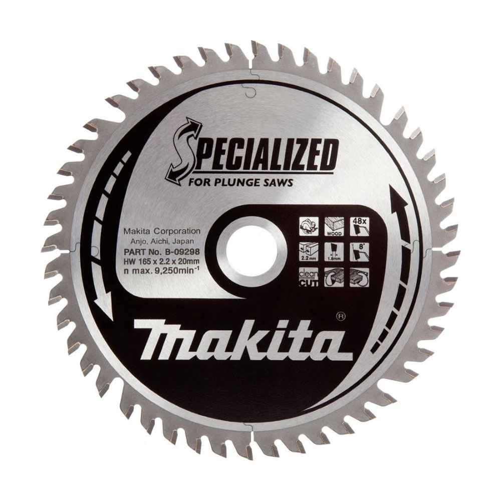SPECIALIZED PLUNGE CUT BLADEB-09298 Blades Designed specifically for Plunge Type Saws. Available for cutting both wood and aluminium, they are especially designed for a smooth clean cut. Plunge saw blades carry a similar specification to the Premium MakBlade Plus, with a patented technology dampening vibration. The low vibration blades run truer with less wobble easily plunging into material with little effort. • Vibration dampening system featuring resin bond filled laser cuts and body slots. • Precision plate tensioning for a flatter blade and truer cuts. • Available for wood and aluminium cutting.