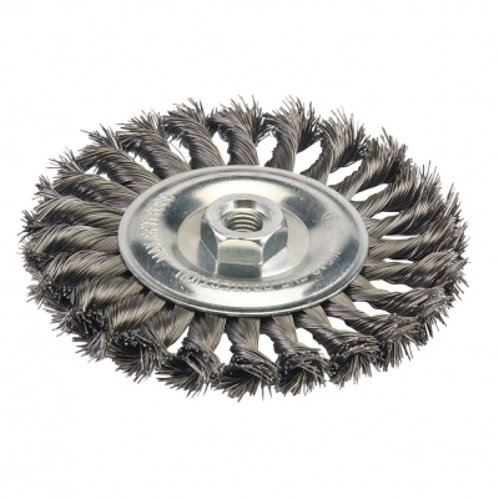 Steel Twist-Knot Wheel 150mm. High tensile steel wire, 0.5mm diameter, for rust and paint removal, descaling, deburring and preparation of welding seams. For metal and stone working, cleaning, surface preparation and fabrication tasks. Use with angle grinders. M14 x 2 female thread.