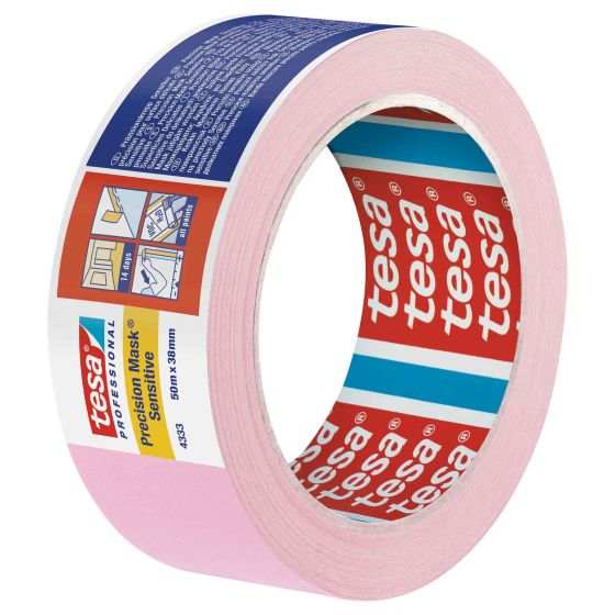The Tesa 4333 pink masking tape is a reliable, precision product with balanced acrylic adhesive. It is perfectly suited for painting work on sensitive surfaces such as wall coverings, wallpaper and varnished surfaces. This tape is extremely gentle, yet sticks firmly and prevents paint tears without damaging the surface. This innovative masking tape comprises a tear-proof, extremely thin special backing which is coated with an acrylate adhesive compound and is particularly easy to use. This tape was developed especially for applications where maximum precision is vital. It is 0.08mm thick, 50mm wide and 50m long. Note: Do not leave the tape on sensitive surfaces for more than a week. Otherwise, the surface could get damaged when removing it.