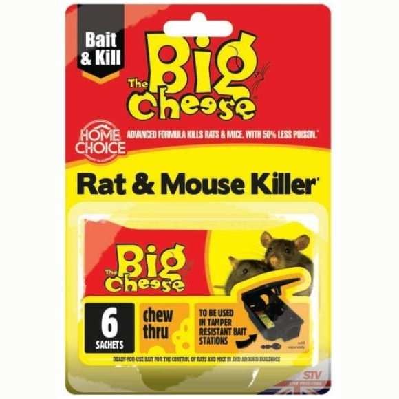 This Big Cheese Rat & Mouse Killer Bait contains six pre-measured natural grain bait sachets. No bait handling is required. Contains a highly palatable bait, which kills rodents with just a few feeds. Keep out of reach of children and pets. Always read the instructions carefully, prior to use.