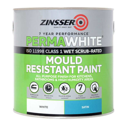 For high-moisture areas like bathrooms and kitchens, Zinsser PermaWhite® is the ultimate mould-resistant paint. This tough, scrubbable paint is specially formulated to combat mould and mildew in humid, poorly circulated spaces. Its durable film resists cracking, peeling, and blistering for up to 7 years, even bonding to glossy or solvent-based paints without sanding. PermaWhite® also seals drywall, cement block, and concrete. Available in a Matt finish for a durable low sheen, it ensures your high-humidity rooms stay looking fresh and clean.