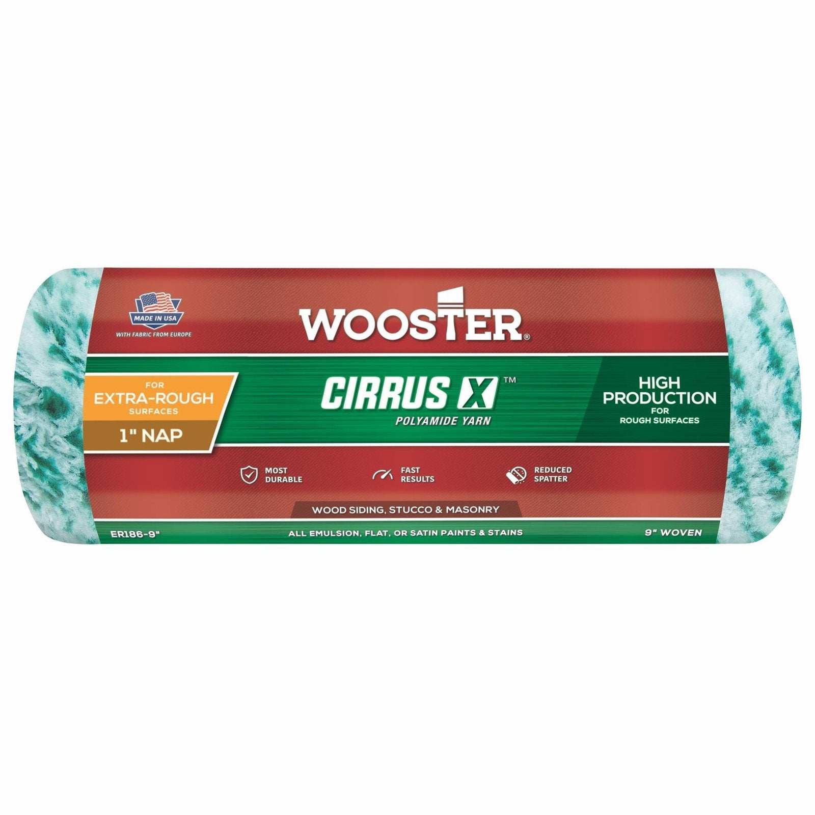 Versatile roller sleeve for fast coverage. Easy to load and delivers paint consistently with less spatter. The woven polyamide fabric is durable and has a paint reservoir core. Cirrus X is excellent on rough surfaces: exterior brick, masonry, concrete and timber. These rollers also work well for undercoats, primers and mist coats on new plaster and semi-smooth interior walls, ceilings and floors. Use with: emulsions, eggshells, acrylics, vinyl, flat and satin paints as well as water-based stains and woodcare. Available for the full range of Wooster roller frames from 4.5" to 18". The closed-ends on the mini roller version make it easy and quick to paint into corners.