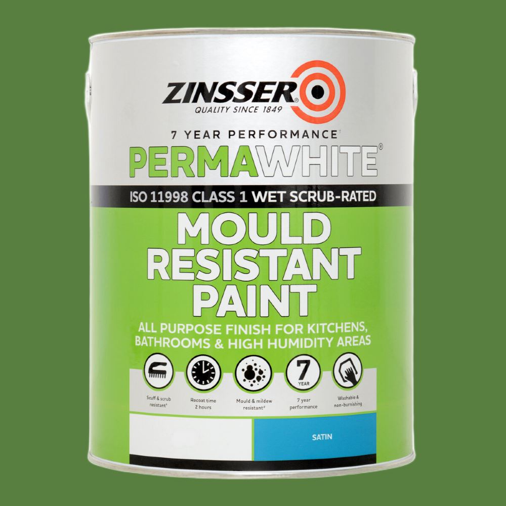 Zinsser Perma-White Interior Satin is a professional-grade, water-based acrylic paint engineered for industrial-strength mold and mildew protection in high-moisture environments. This high-production formula is guaranteed to prevent mildew growth on the paint film for five years, making it ideal for bathrooms, kitchens, and laundry rooms. The rapid-drying, low-odor composition functions as a self-priming coating that bonds securely to glossy surfaces without sanding. It provides a durable, scrub-resistant satin finish that is easy to clean and maintains its structural integrity in demanding residential or commercial interior spaces prone to humidity and frequent washing.