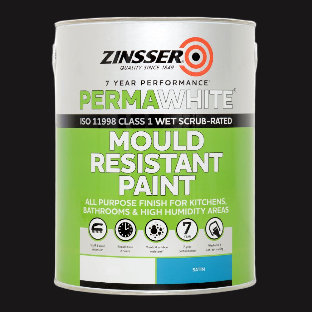 Zinsser Perma-White Interior Satin is a professional-grade, water-based acrylic paint engineered for industrial-strength mold and mildew protection in high-moisture environments. This high-production formula is guaranteed to prevent mildew growth on the paint film for five years, making it ideal for bathrooms, kitchens, and laundry rooms. The rapid-drying, low-odor composition functions as a self-priming coating that bonds securely to glossy surfaces without sanding. It provides a durable, scrub-resistant satin finish that is easy to clean and maintains its structural integrity in demanding residential or commercial interior spaces prone to humidity and frequent washing.
