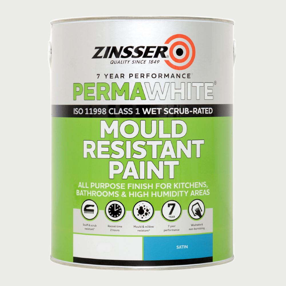 Zinsser Perma-White Interior Satin is a professional-grade, water-based acrylic paint engineered for industrial-strength mold and mildew protection in high-moisture environments. This high-production formula is guaranteed to prevent mildew growth on the paint film for five years, making it ideal for bathrooms, kitchens, and laundry rooms. The rapid-drying, low-odor composition functions as a self-priming coating that bonds securely to glossy surfaces without sanding. It provides a durable, scrub-resistant satin finish that is easy to clean and maintains its structural integrity in demanding residential or commercial interior spaces prone to humidity and frequent washing.