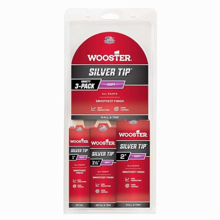Wooster Silver Tip 3 Pack Varnish 1”, 1.5”, 2” • White & silver CT polyester filaments for excellent leveling and smoothing • Very soft formulation, feather stroke • Stainless steel ferrule • Hardwood handle